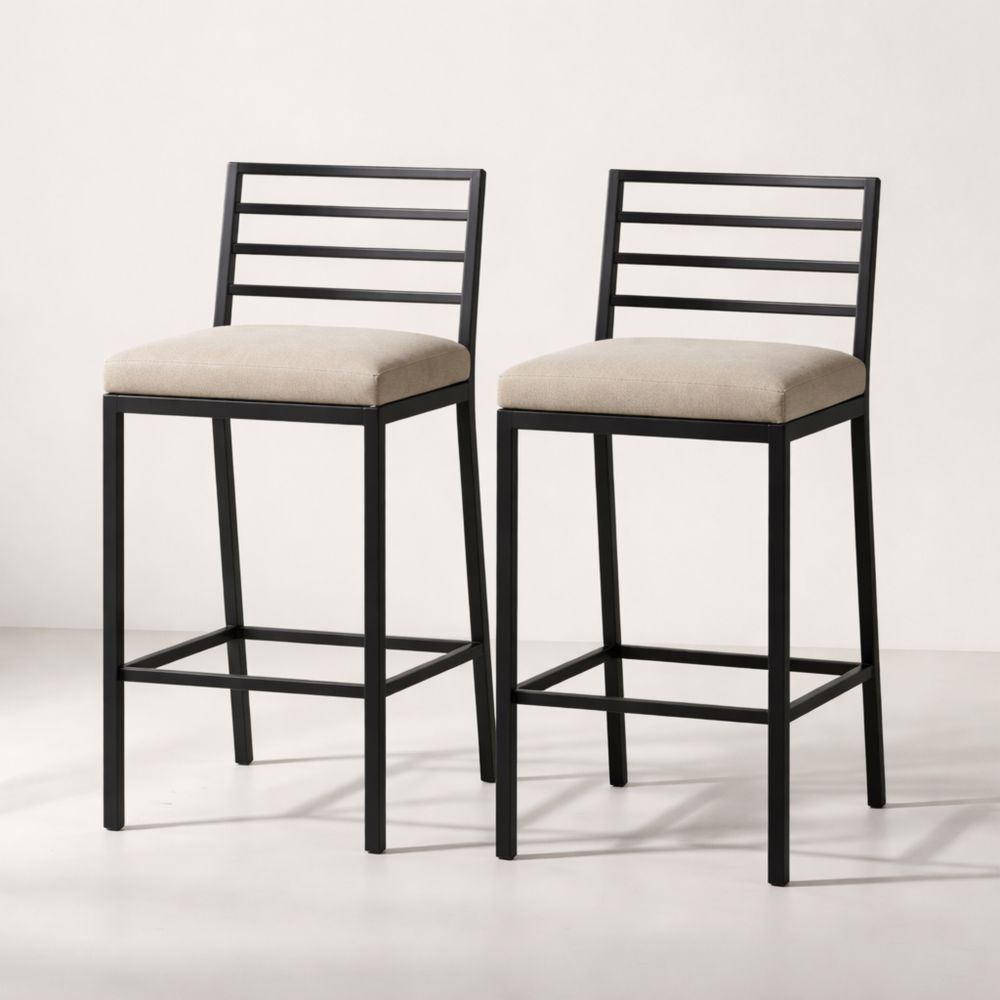 Set of 2 Metal Counter Stools with Beige Upholstered Seats and Black Frame