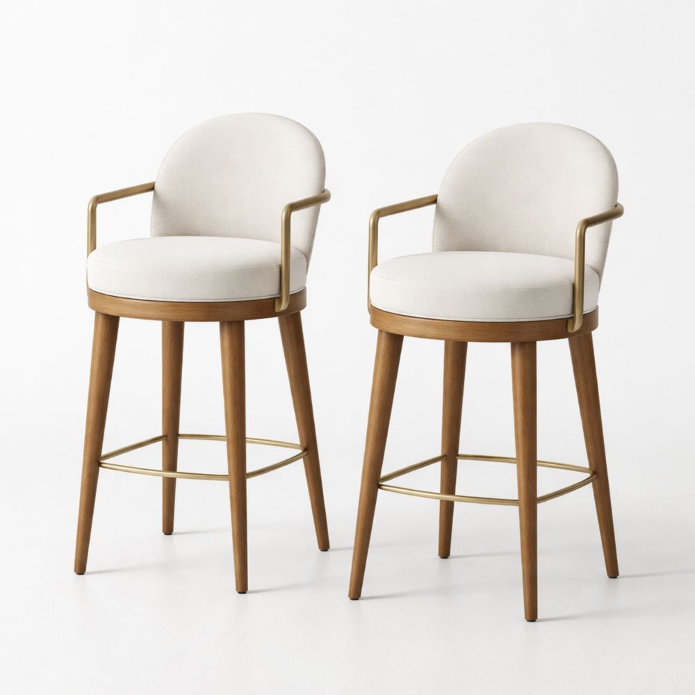 Set of 2 Fabric Swivel Bar Stools with Metal Armrests and Wood Legs Beige