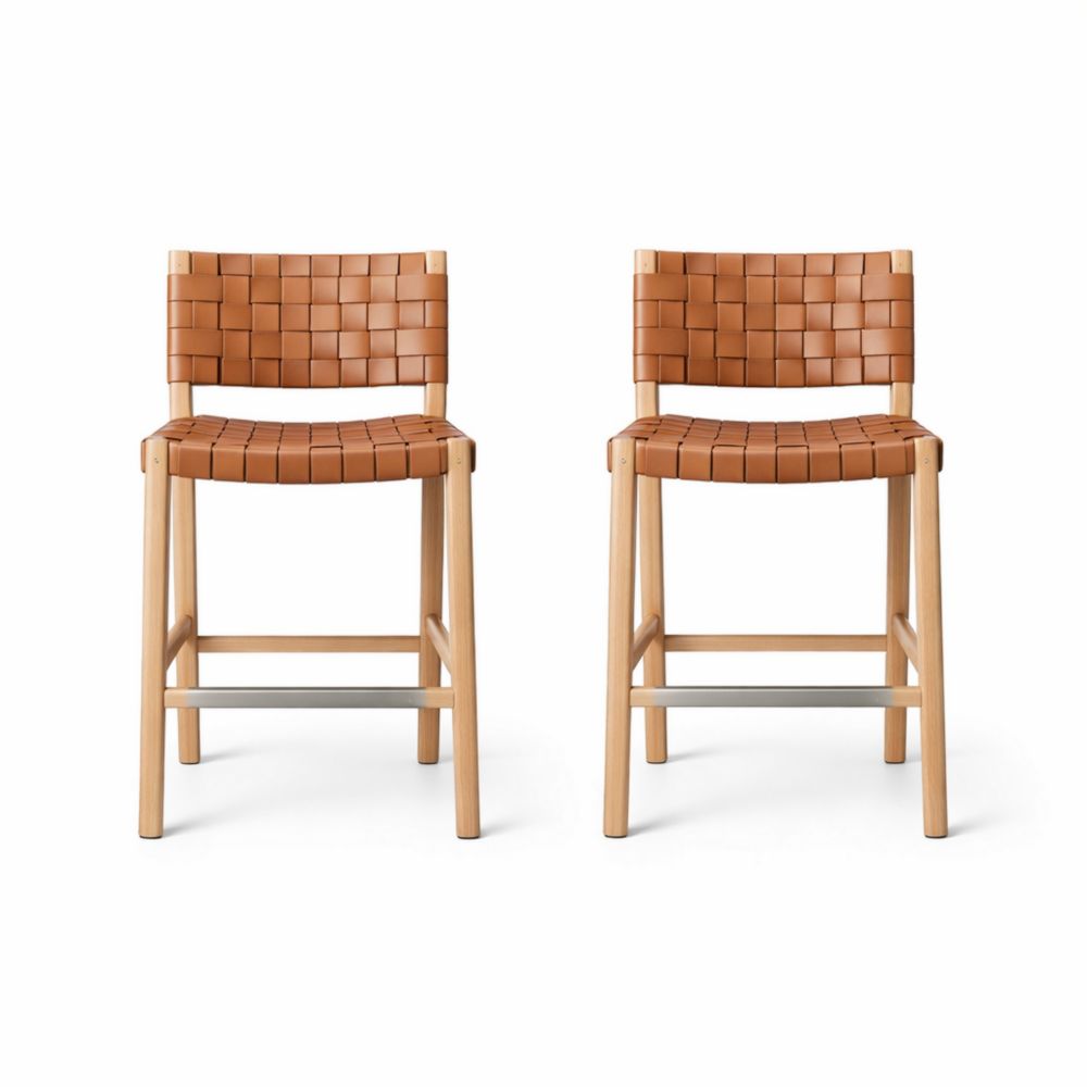 Set of 2 Woven Back Counter Stools Beech Wood Tan Faux Leather